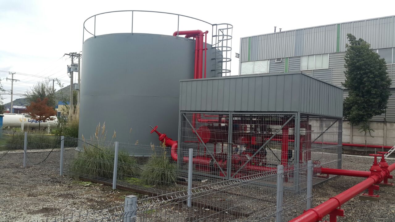 Protección automática para estanques con líquidos altamente inflamables con anillo perimetral de rociadores que distribuyen agua para refrigerar exteriormente y cámaras de espuma para aislar la superficie interior del líquido en el estanque, realizado en la Empresa Brenntag Chile S.A.